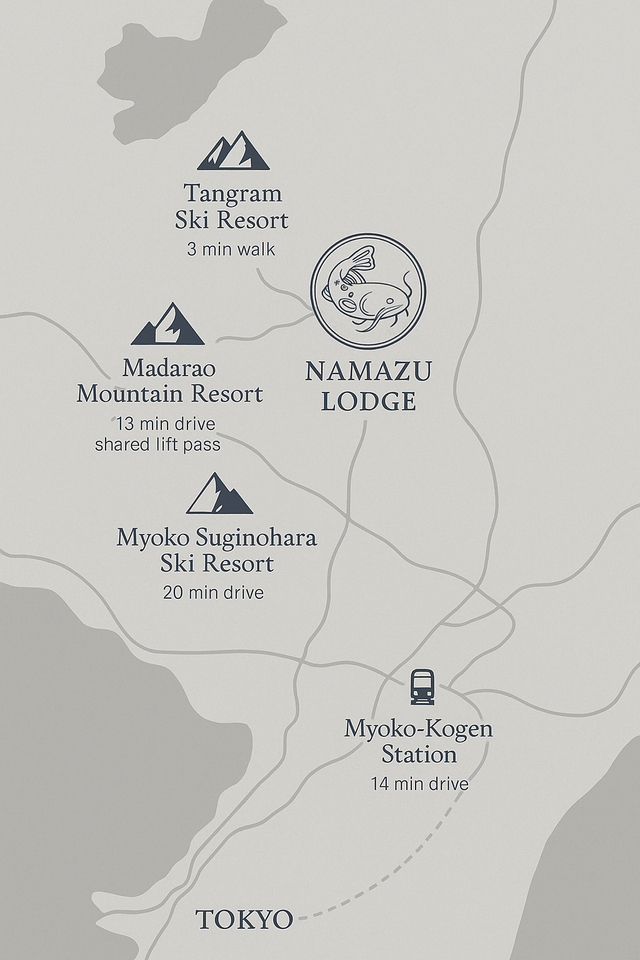 Namazu Lodge is perfectly positioned for both adventure and tranquillity. You’ll find us just 2.5 hours from Tokyo by train, 10 minutes from Myoko Kogen Station, within easy reach of Myoko Suginohara, Norjiri Lake, and the region’s famous onsen villages.
